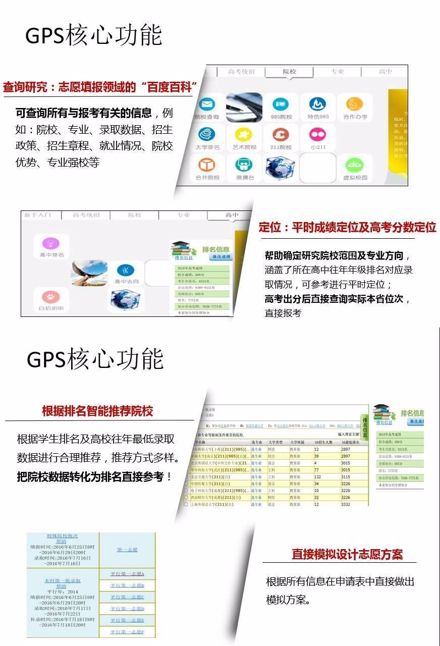 高考GPS分为四大模块,四大模块包含了高考GPS的方方面面,报考需要的信息在GPS中都可以查到。 高考后,还能根据孩子考分推荐学校,有了高考GPS,您就不用花时间去搜索大量的志愿填报数据、知识。