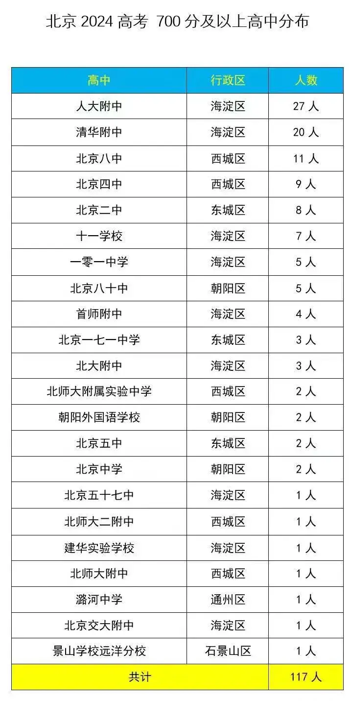 北京市前20名,清华附中占4人。700分以上20人。据了解,今年高考状元也出自清华附中。