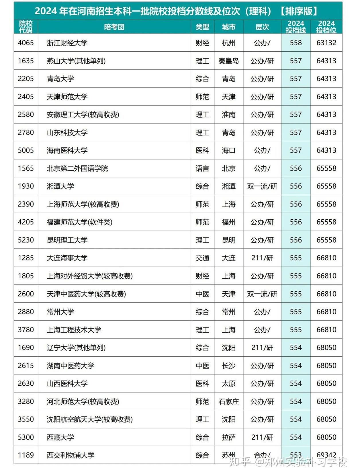 2025年2025年河南高考一本院校投档及位次→理科二